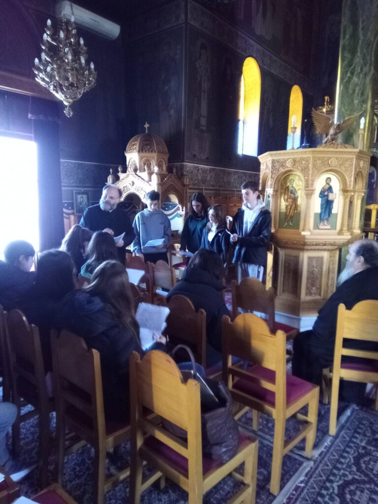 Την Παρασκευή, 26 Ιανουαρίου 2024, οι μαθητές και οι μαθήτριες του τμήματος Β3 μαζί με τους εκπαιδευτικούς π. Ευάγγελο Πριγκιπάκη (ΠΕ01) και Ελένη Κατσιγιάννη (ΠΕ02) επισκέφτηκαν τον Ιερό Ναό Αγίου Νεκταρίου Πατρών στο πλαίσιο της υλοποίησης του διαθεματικού διδακτικού σεναρίου με τίτλο: «Η παρουσία της ορθόδοξης παράδοσης στη νεοελληνική ποίηση». Σκοπός της επίσκεψής μας ήταν η πραγματοποίηση επιτόπιας έρευνας, ώστε τα παιδιά να «ανακαλύψουν» με διερευνητική μέθοδο τα στοιχεία της ορθόδοξης παράδοσης και λατρείας που αναδείχθηκαν μέσα από τη μελέτη αντιπροσωπευτικών ποιημάτων στη σχολική αίθουσα. Απώτερος στόχος μας ήταν να αποκτήσουν βιωματική εμπειρία από την άμεση εποπτική τους προσέγγιση, αλλά και να εμπλουτίσουν περισσότερο τις γνώσεις τους γύρω από αυτά.