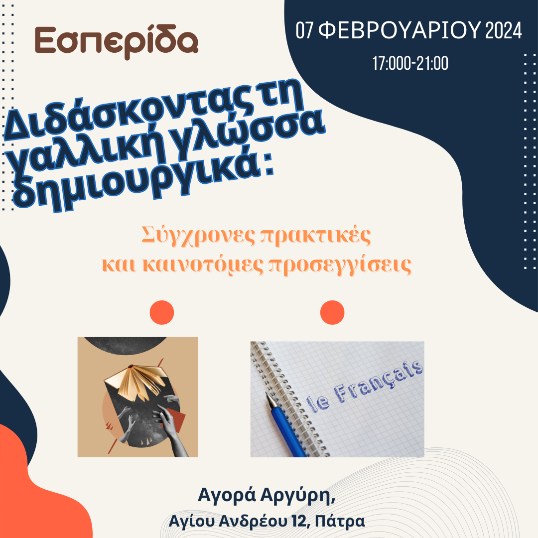 Διοργάνωση εσπερίδας στις 7/2/2024 στο Συνεδριακό Κέντρο της Αγοράς Αργύρη (Αγ. Ανδρέου 12, Πάτρα) με θέμα : “Διδάσκοντας τη γαλλική γλώσσα δημιουργικά : Σύγχρονες πρακτικές και καινοτόμες προσεγγίσεις” .