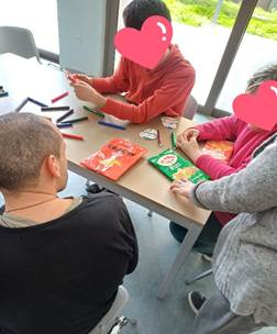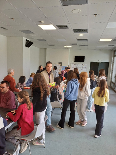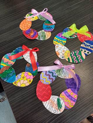 Έπειτα, οι μαθήτριες αλληλοεπίδρασαν με τους ωφελούμενους φτιάχνοντας στεφάνια από πασχαλινά αυγά, τα οποία ζωγράφισαν από κοινού.